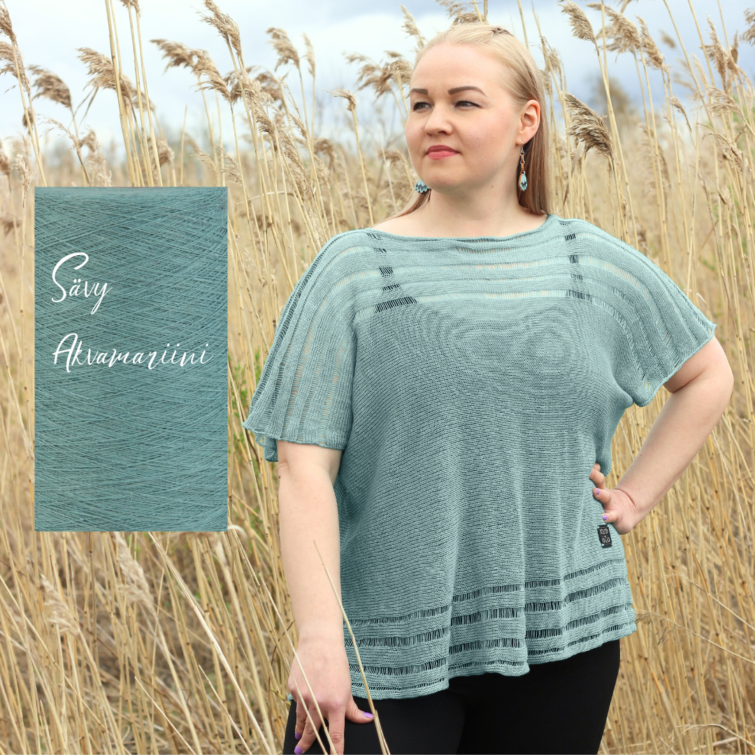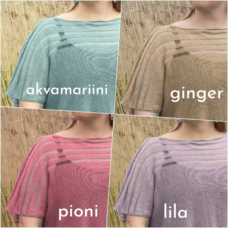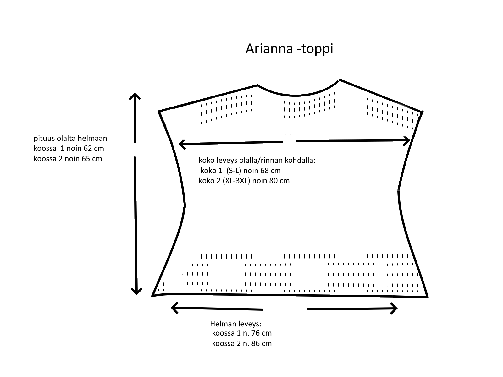 Arianna on rento, mutta tarvittaessa juhlava pellavaneuletoppi. Laatikkomallisessa puserossa kulkee avoimet aksenttiraidat olalla sekä helmassa molemmin puolin. Pääntie on leveähkö venepääntie. Helma muotoiltu kevyesti A-linjaiseksi. Epäsymmetrisen symmetrisesti sijoitetut pitsiraidat ovat kauniit ja tuovat malliin ihanaa ilmavuutta. Pitsiraidat ovat hieman alttiita langanvedoille, joten otathan tämän huomioon!
