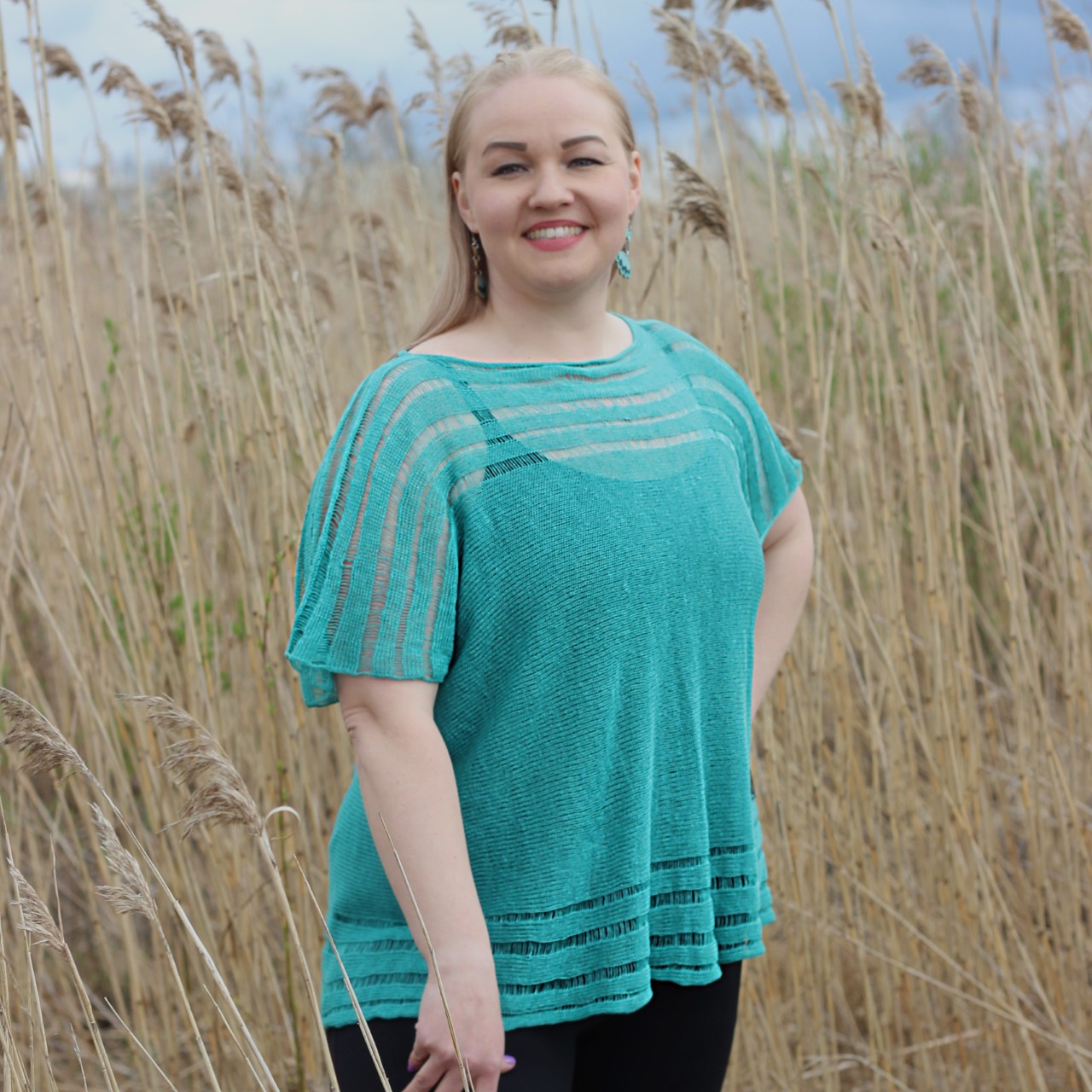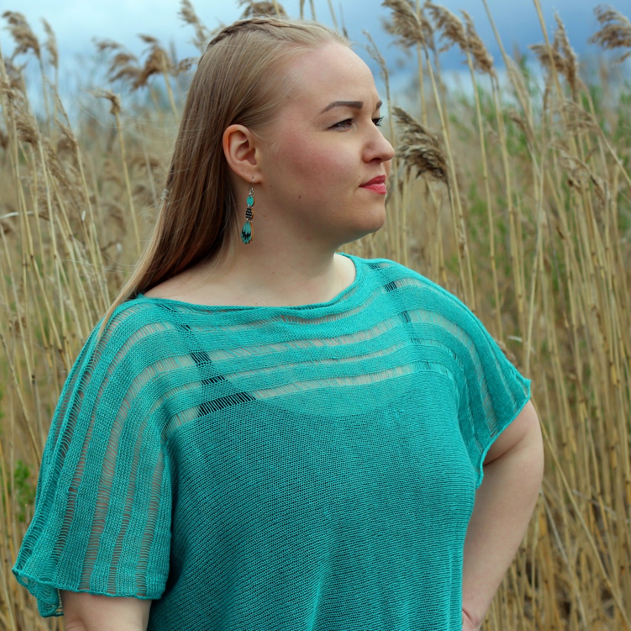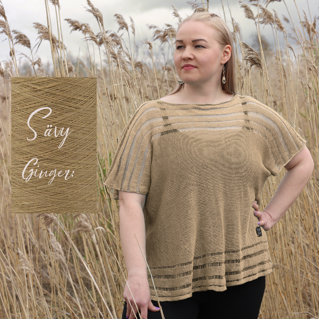 Arianna on rento, mutta tarvittaessa juhlava pellavaneuletoppi. Laatikkomallisessa puserossa kulkee avoimet aksenttiraidat olalla sekä helmassa molemmin puolin. Pääntie on leveähkö venepääntie. Helma muotoiltu kevyesti A-linjaiseksi. Epäsymmetrisen symmetrisesti sijoitetut pitsiraidat ovat kauniit ja tuovat malliin ihanaa ilmavuutta. Pitsiraidat ovat hieman alttiita langanvedoille, joten otathan tämän huomioon!