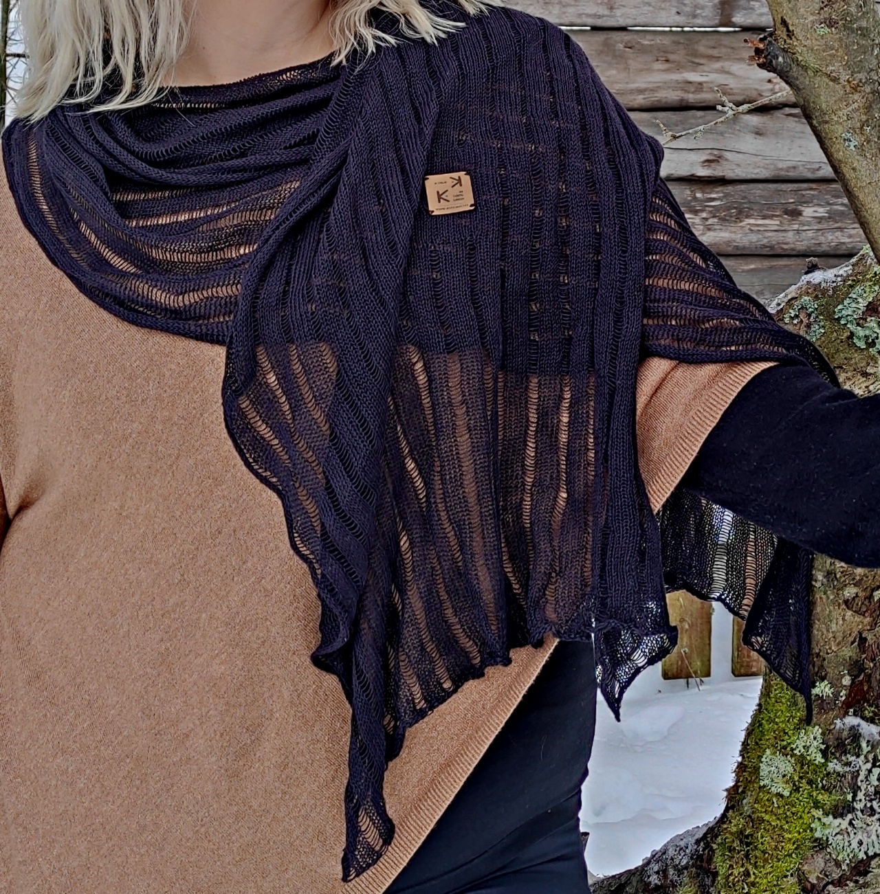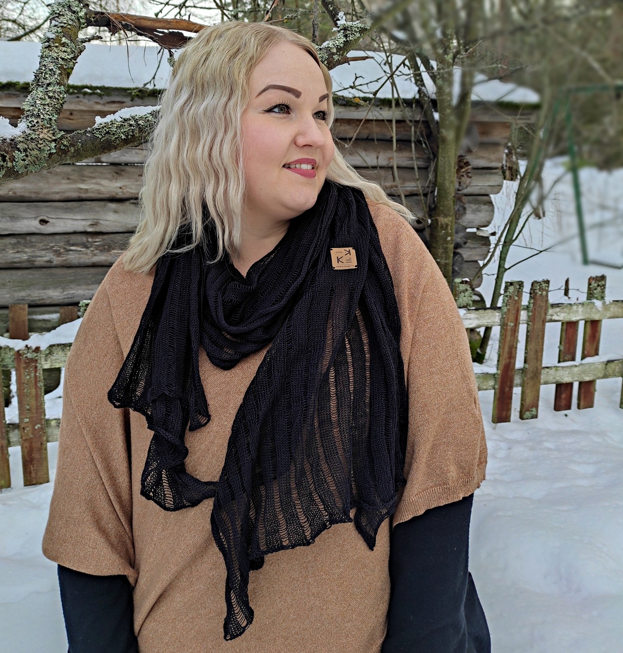 Käytä rentona kaulahuivina arjessa, avaa harteille näyttäväksi kaulahuiviksi ja kiinnitä huivineulalla tai kieputa turbaaniksi. Yksityiskohtana Kudokkon tyylikäs, keinonahkainen tuotemerkki. Kokeile myös solmia huivi pitkistä kulmistaan ja käytä lenkkihuivin tapaan - luot helposti jännittäviä muotoja! Pesun yhteydessä kuosittele huivi reippaasti muotoonsa.