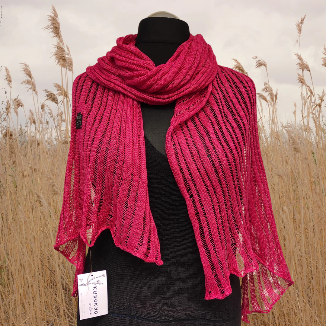 Pinja on pitkä pellavaneulehuivi, jonka päät on viistotettu ja pitsimäinen ribbipinta on eläväisen epäsymmetrisesti rytmitetty. Ilmava ja kevyt huivi kerrostuu kaulalle ja lämmittää viileänäkin päivänä -pärjäät tällä huivilla pitkälle talveen!
