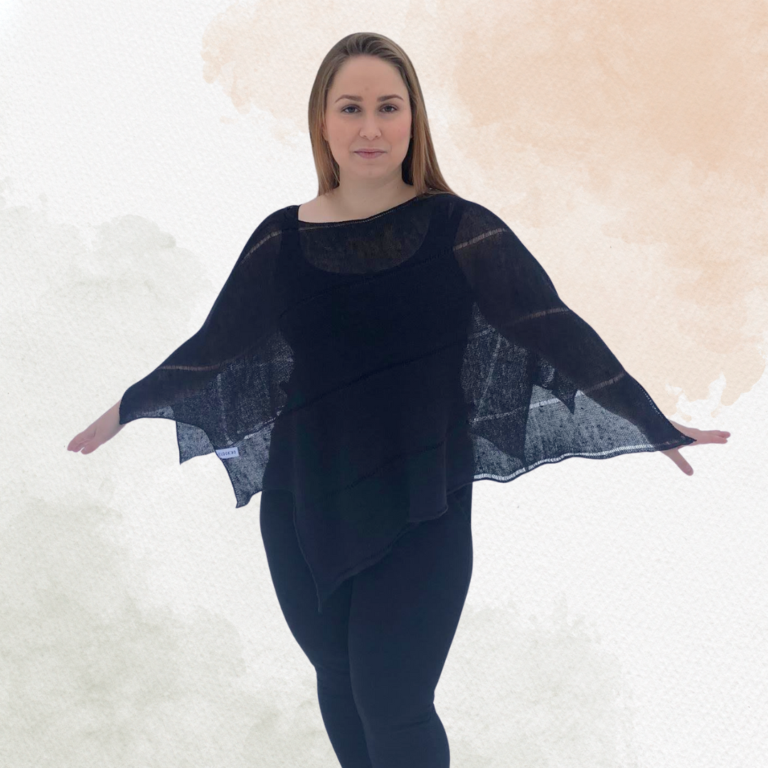 Venus Poncho on ihana, boheemi, tyylikäs, erityisesti meille lyhyemmille veenuksille suunniteltu pellavaneuleponcho. Venuksen rakenne on lähes saumaton, mikä tekee siitä supermiellyttävän käyttää. Voit joko korostaa ponchon särmikkyyttä tai häivyttää sitä vaihtamalla ponchon asentoa.